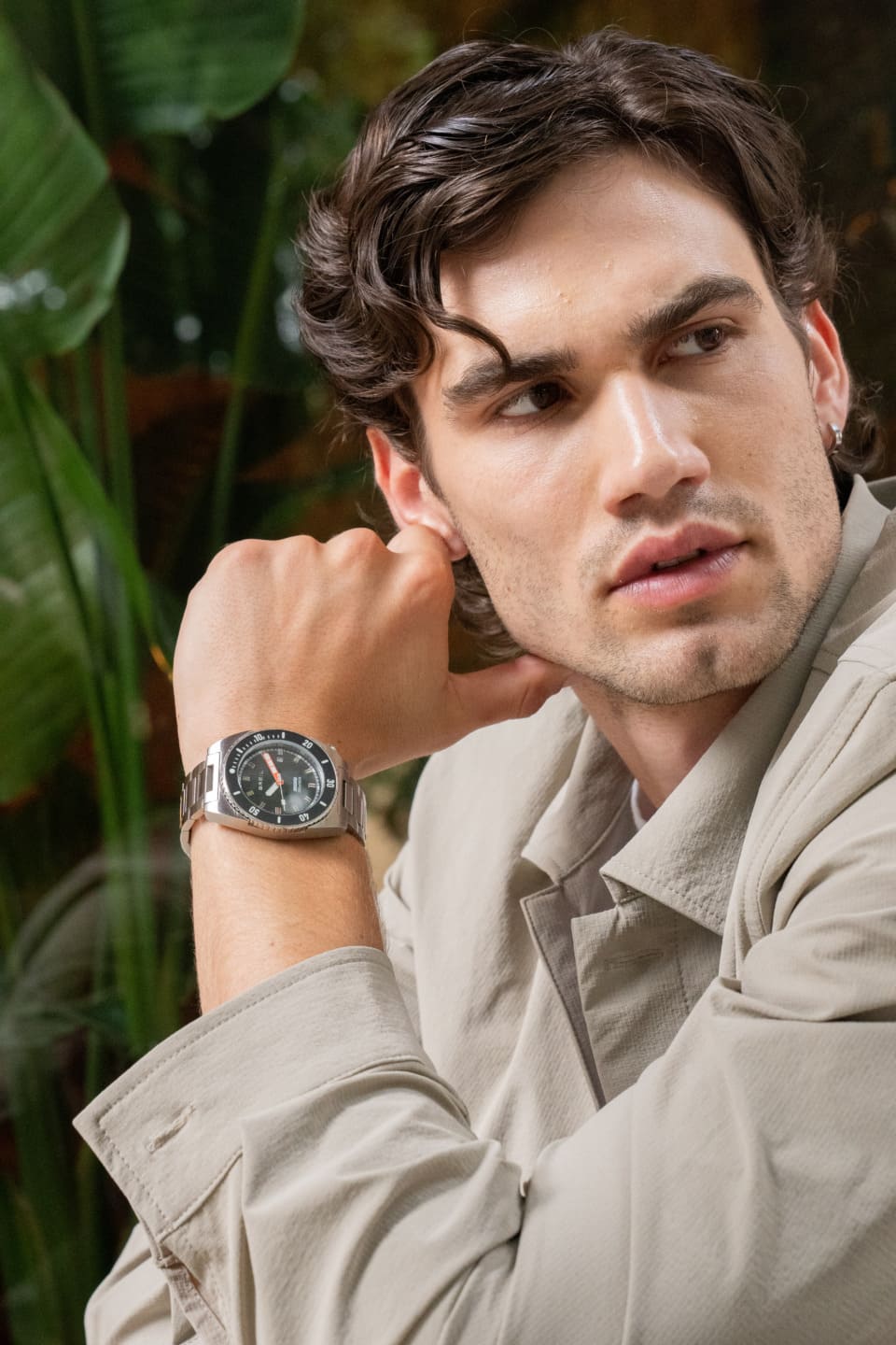 Il modello Wild Green è ispirato alla bellezza della Maremma, terra in cui la natura regna sovrana. In questa zona, la località di Punta Ala è incastonata sulla costa e attrae appassionati dell’aria aperta e della vela: il modello Manta Seeker 200m celebra le sue sfumature attraverso la finitura IP wild green della cassa d’acciaio con finish matt, la lunetta di alluminio e il cinturino in tela verde.