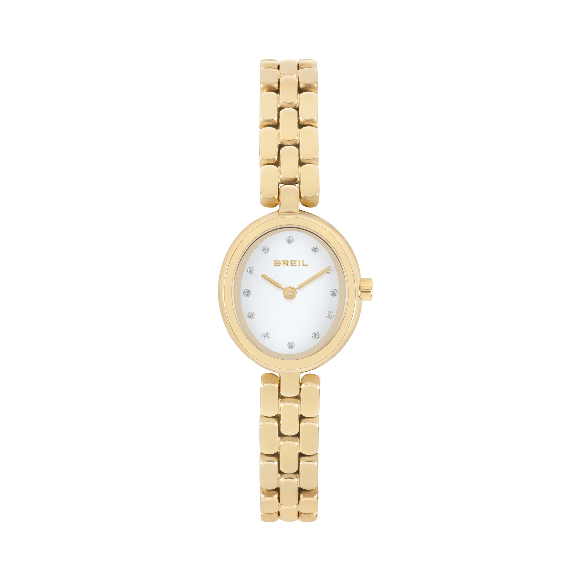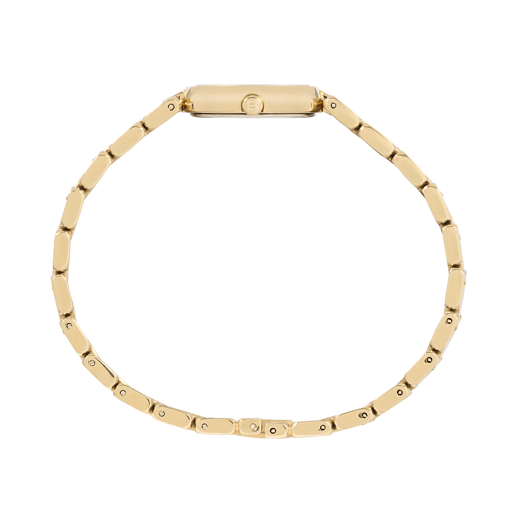 The Eclat women's time-only watch is much more than an accessory, it is a true jewel to be worn every day. The polished gold-coloured steel bracelet elegantly hugs the wrist, while the case houses a bright white dial embellished with crystal hour markers. The silver hands add a sophisticated touch, ensuring maximum readability. Wear it with a monochrome total look to enhance its brightness, or wear it with an oversized look for a refined and contemporary contrast.