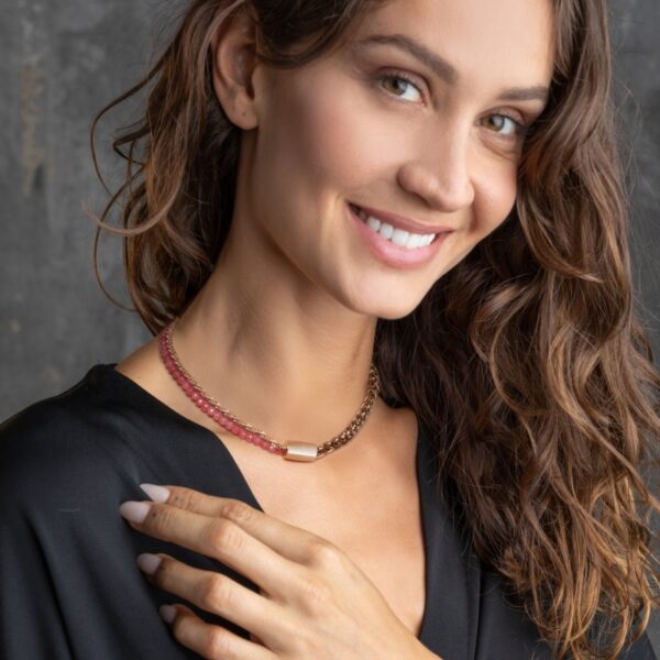 Un Chocker estremamente versatile per colorare la tua estate. Le sfumature e i colori del cielo che si creano durante l’aurora boreale ricordano le tonalità dell’agata rosa che si abbina perfettamente alla colorazione rose gold.