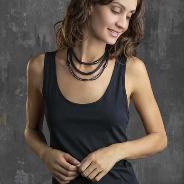 Per la donna che nasconde un’anima rock. L’elemento Stardust unito al Soft Set illumina il decolté, grazie alla lucentezza dell’ematite. La collana è perfetta da indossare semplicemente con jeans e T-shirt oppure con un vestito total black.