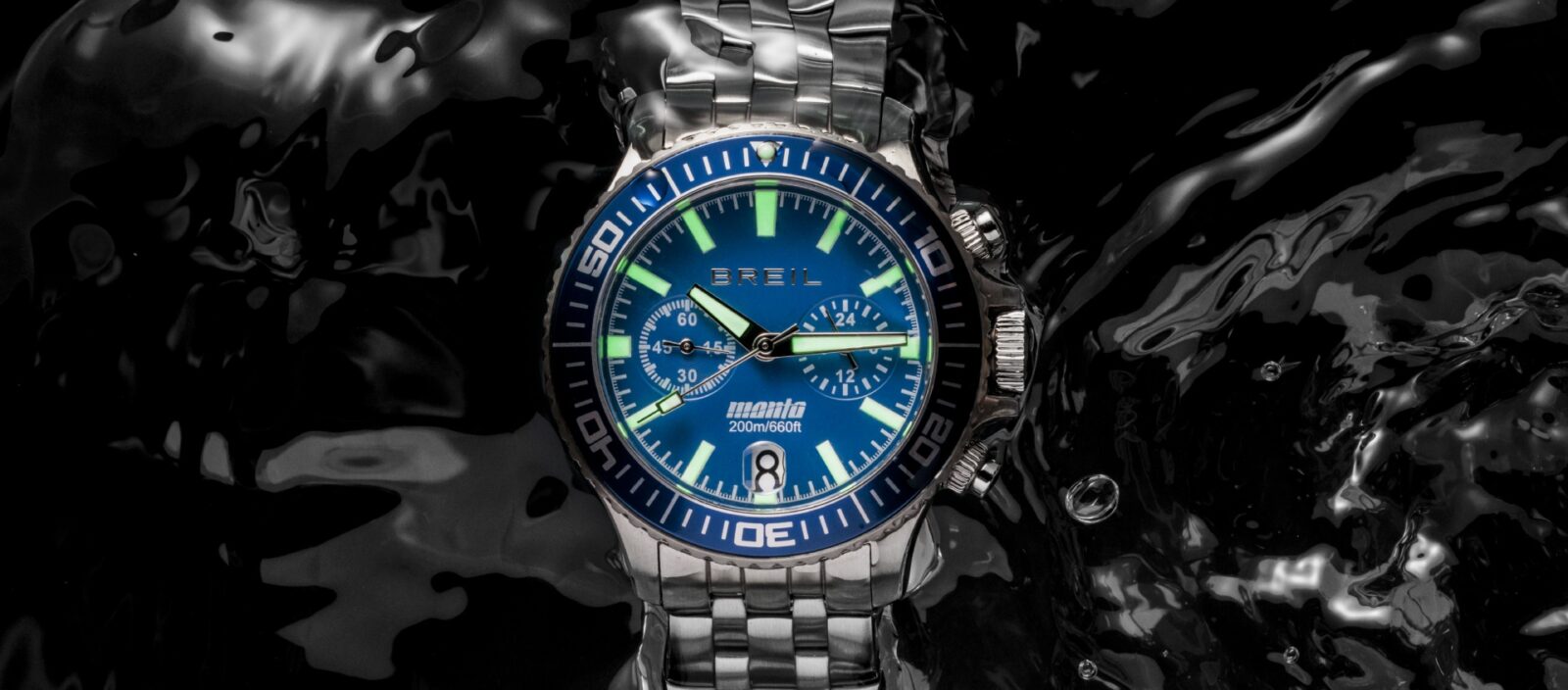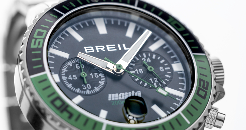 La lunetta girevole unidirezionale zigrinata con scala sessagesimale – utile per il calcolo dei tempi di immersione – si veste di nero, di blu o di nero e verde con luminous a ore 12, coloraizoni a cui fanno eco le tinte dei quadrati e dei contatori, ma anche della lancetta dei secondi, delle lancette crono e di alcune iscrizioni sul quadrante.