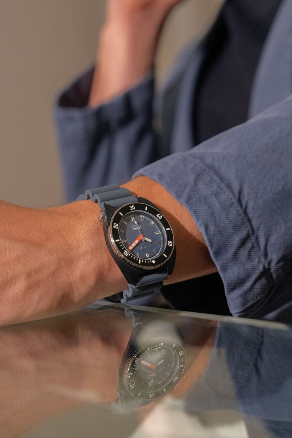 Per il modello Deep Black l’ispirazione deriva dal litorale laziale, territorio prediletto dai surfisti alla ricerca dell’onda perfetta. Il Manta Seeker, qui, unisce una cassa d’acciaio mat con lunetta in alluminio nera ad un quadrante nero e un cinturino a fisarmonica extra resistente: questo plus tipico degli orologi diver assicura una maggiore elasticità, permettendo di indossare l’orologio comodamente sopra la muta e garantendo un fitting confortevole anche per ogni esperienza cittadina.