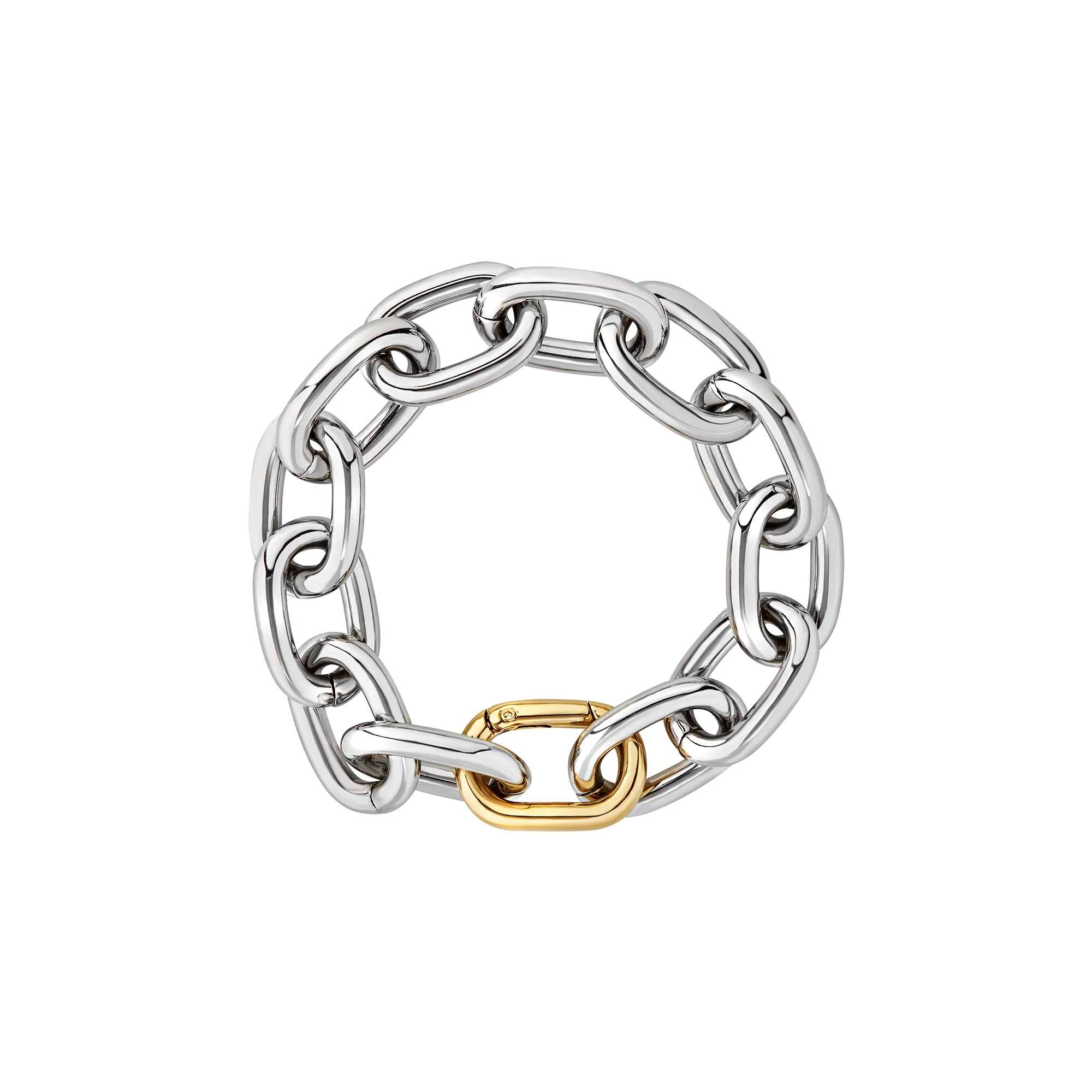 Il bracciale a catena Distinctive in alluminio lucido gold è caratterizzato da maglie ovali ed è completato da una chiusura in acciaio che crea un elegante contrasto cromatico. Un accessorio versatile, perfetto per essere indossato da solo come bracciale statement, capace di dare carattere anche ai look più minimal, oppure abbinato alla versione gold della stessa collezione per trasformarsi in una collana.