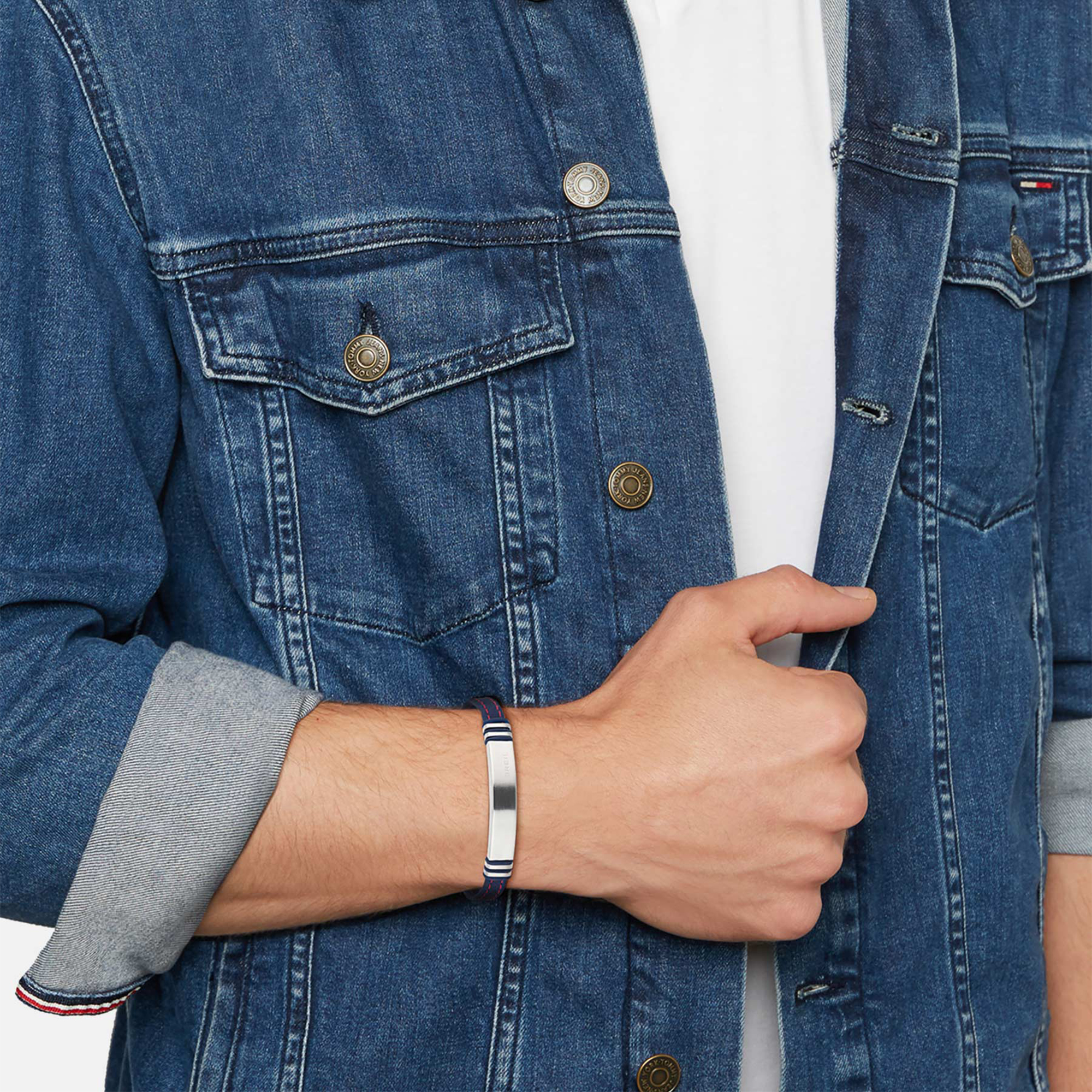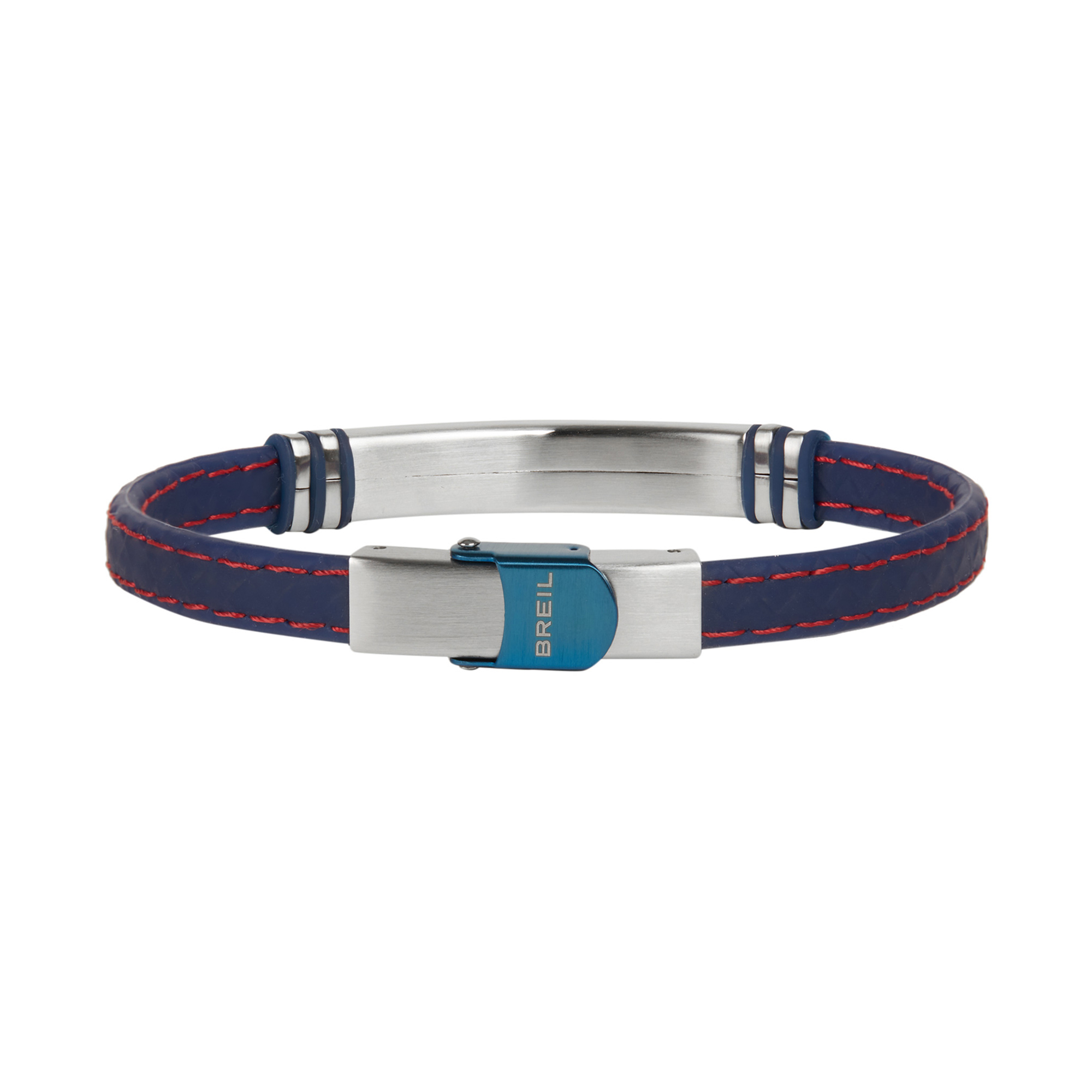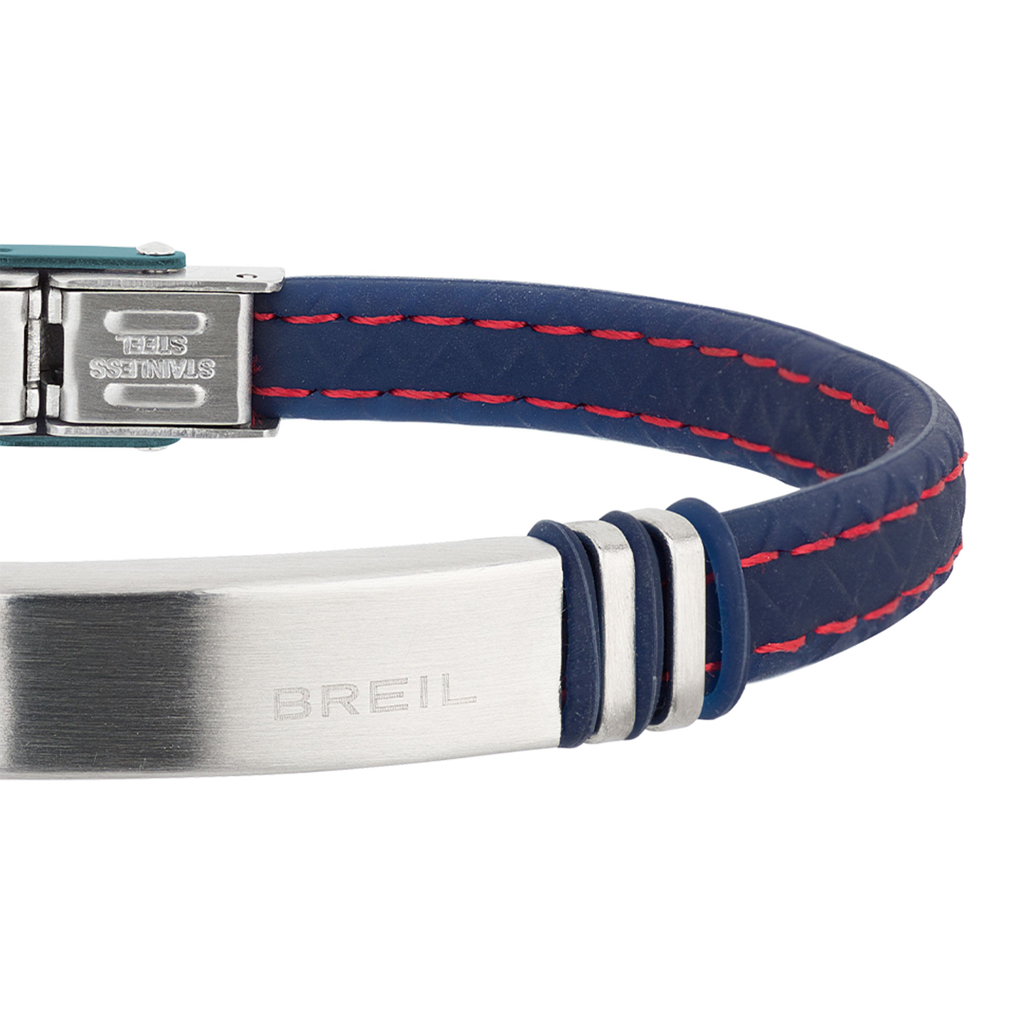 Bracciale maschile casual e disimpegnato: l'acciaio è abbinato al cinturino in silicone blu con impunture a contrasto.