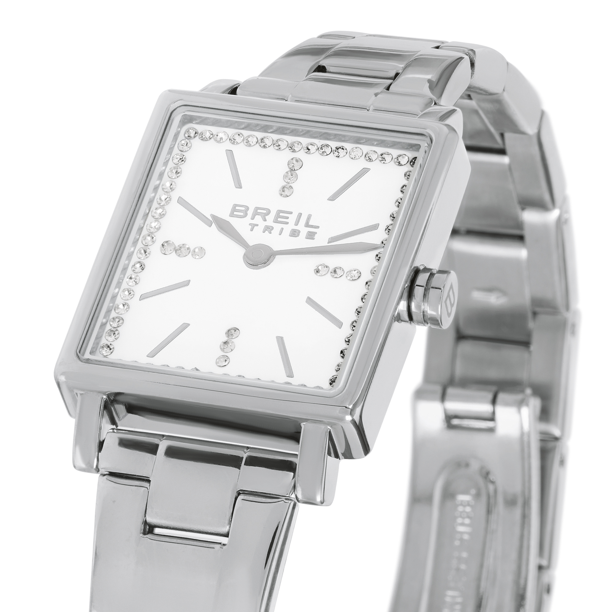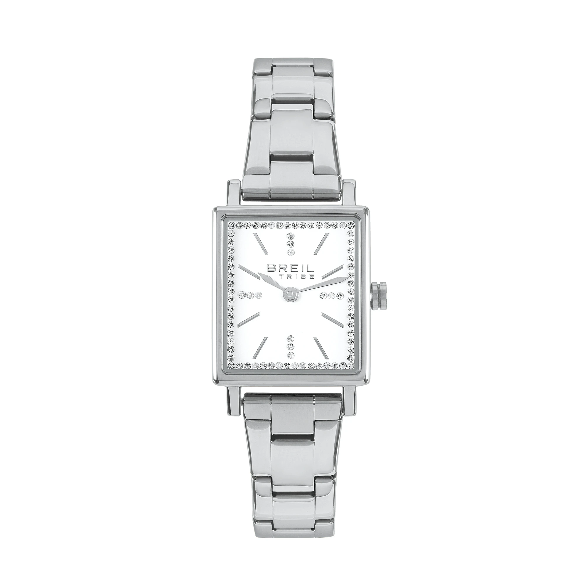 L’orologio da donna Divine si distingue per la sua cassa rettangolare e il quadrante bianco impreziosito da un rehault decorato con cristalli che cattura la luce ad ogni movimento, creando riflessi delicati. Gli indici alternano cristalli luminosi a dettagli silver, regalando un gioco di contrasti sofisticato. A completare il design il bracciale gioiello in acciaio lucido, che avvolge il polso con eleganza.
