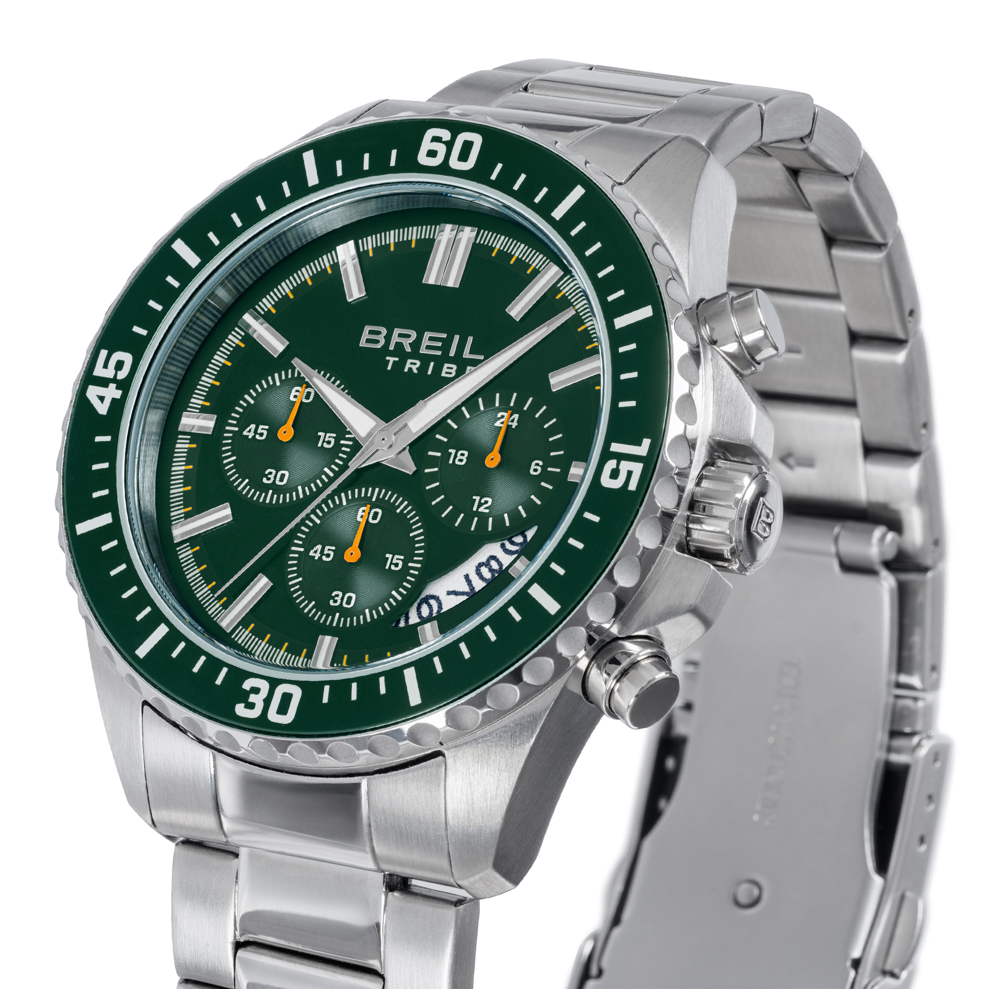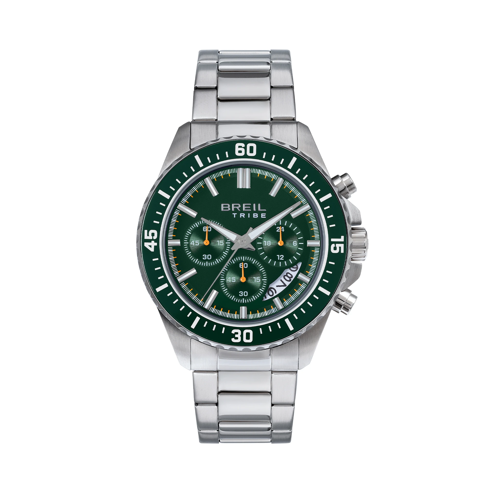 Il cronografo Trial si distingue per la sua cassa da 44 mm in acciaio satinato, abbinata a una lunetta in acciaio con disco in alluminio verde arricchito da dettagli arancioni che ne esaltano il carattere sportivo. Il quadrante forest green con finitura mat conferisce un look grintoso, mentre indici e sfere con trattamento luminous garantiscono massima leggibilità anche in condizioni di scarsa luminosità. Il datario è posizionato tra le ore 4 e 5, per un design funzionale e preciso.