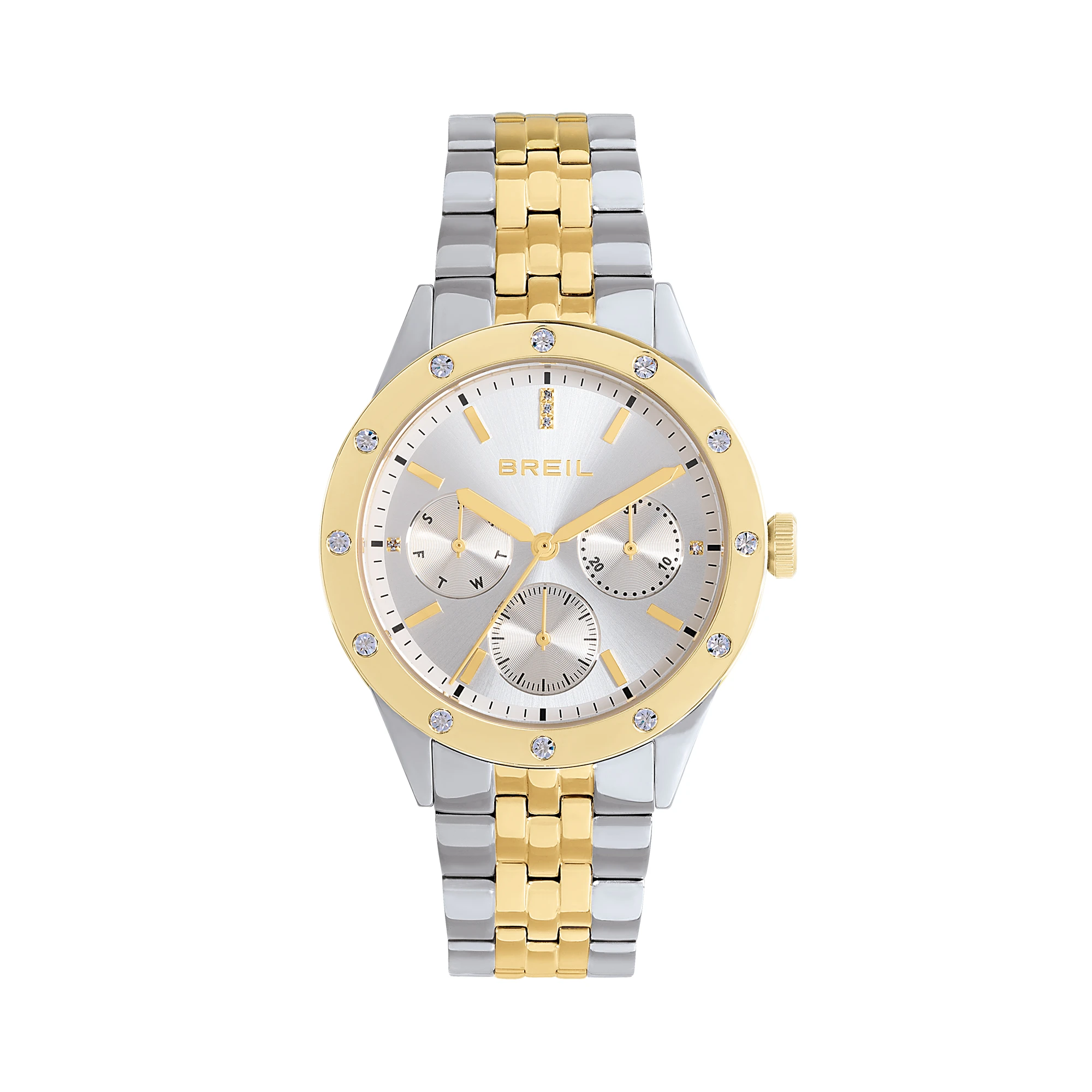 Il cronografo da donna Flurry in acciaio lucido bicolor si distingue per la lunetta impreziosita da 12 cristalli bianchi e per il quadrante color silver con effetto sunray che cattura la luce a ogni movimento. Gli indici gold sono arricchiti da cristalli posizionati alle ore 12, 3 e 9, donando un tocco di brillantezza discreta. Elegante e versatile, è perfetto abbinato a un look da sera o a un blazer strutturato per un look da giorno.